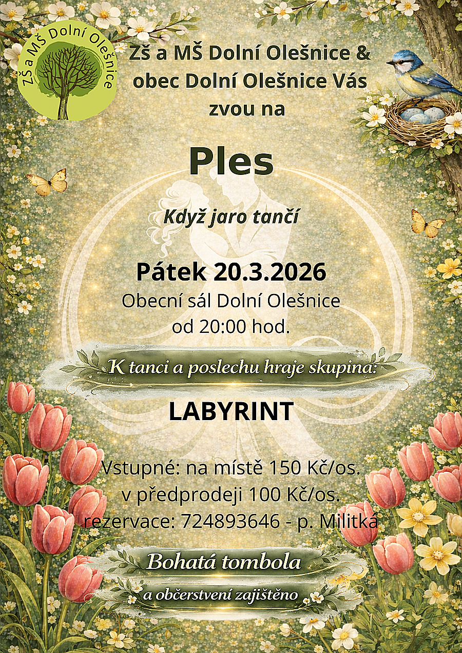 ZŠ a MŠ Dolní Olešnice společně s obcí Dolní Olešnice Vás srdečně zvou na jarní ples „Když jaro tančí“, který se uskuteční v pátek 20. března 2026 od 20:00 hodin v Obecním sále Dolní Olešnice.
