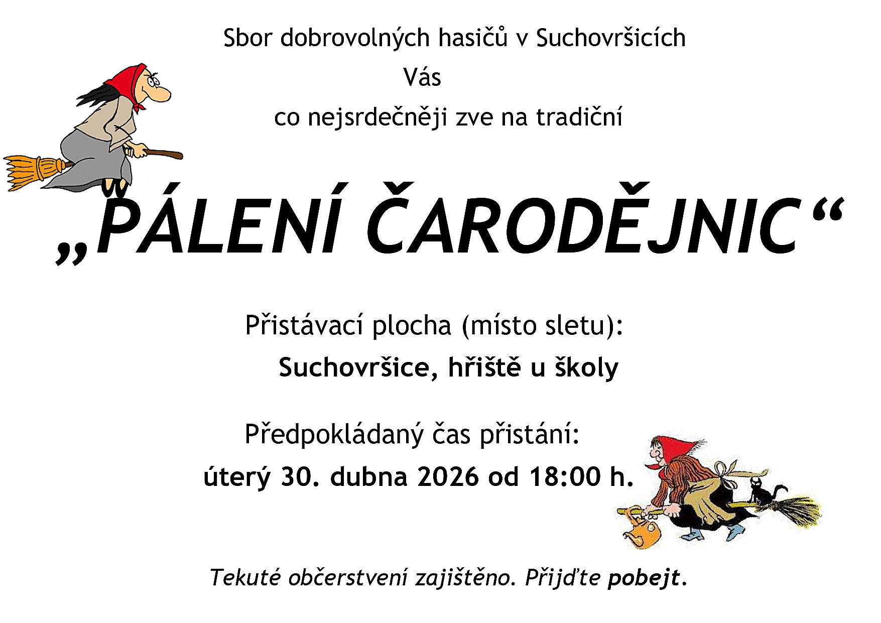 Zveme všechny malé i velké na tradiční pálení čarodějnic. Těšit se můžete na příjemnou atmosféru, posezení u ohně, občerstvení a společné setkání sousedů.