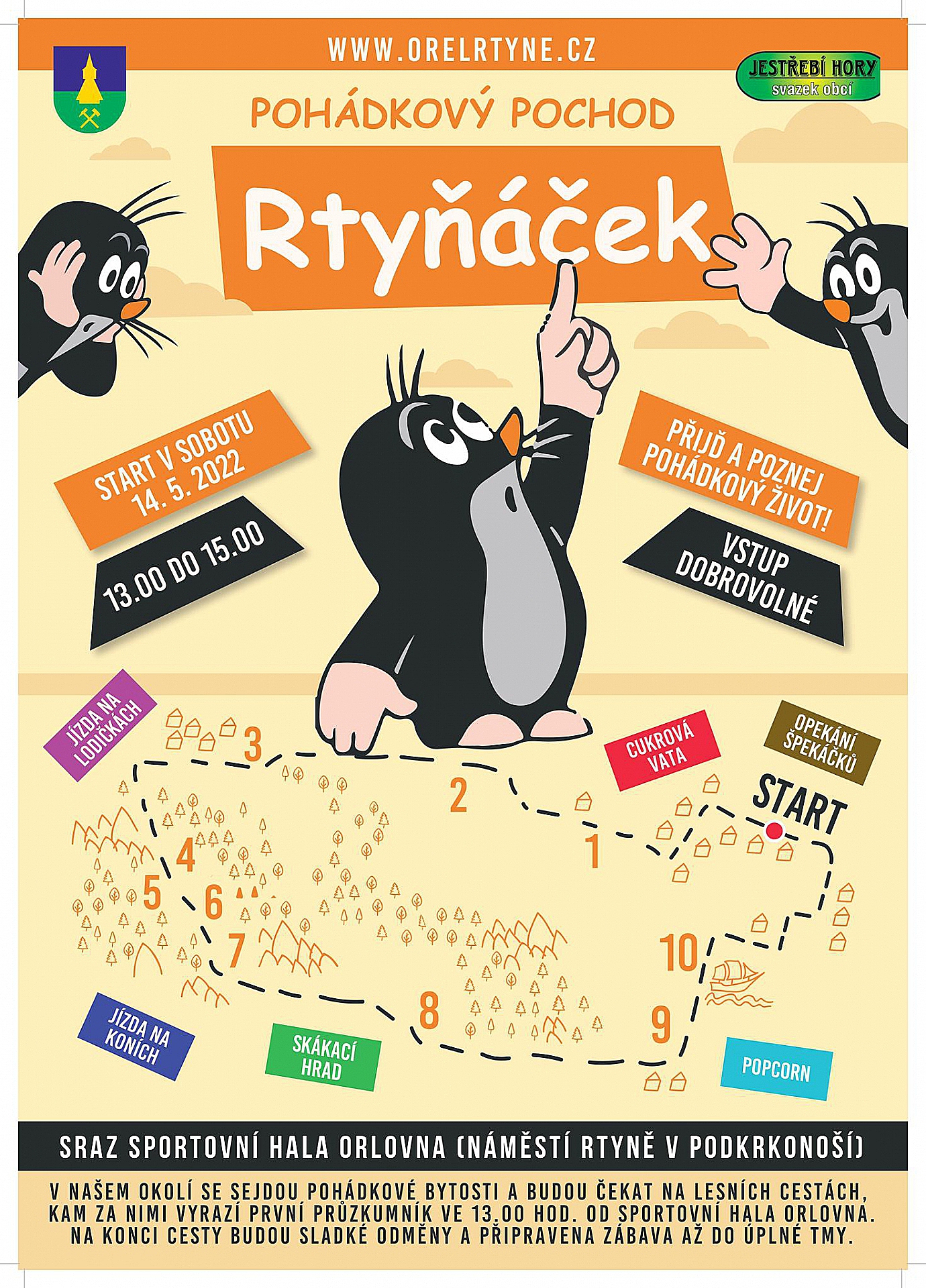 Orel jednota Rtyně v Podkrkonoší vás všechny srdečně zve na tradiční a velmi oblíbený dětský pochoďáček, kde se děti potkají s pohádkovými postavičkami.