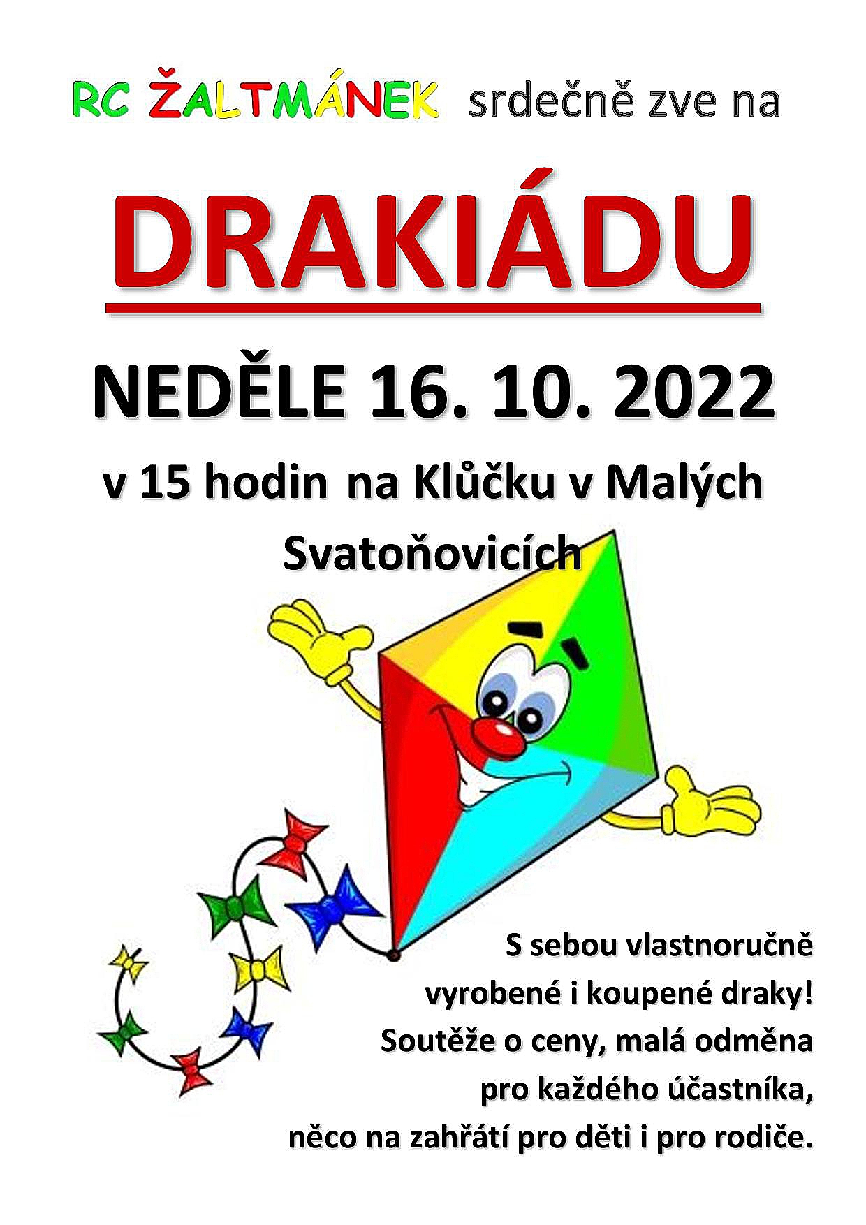 RC Žaltmánek srdečně zve na DRAKIÁDU - v neděli 16.10.2022 v 15:00 hod. na Klůčku v Malých Svatoňovicích.