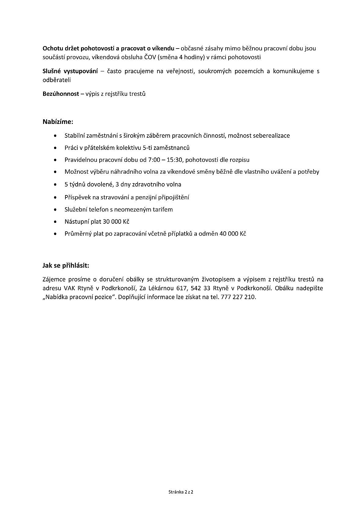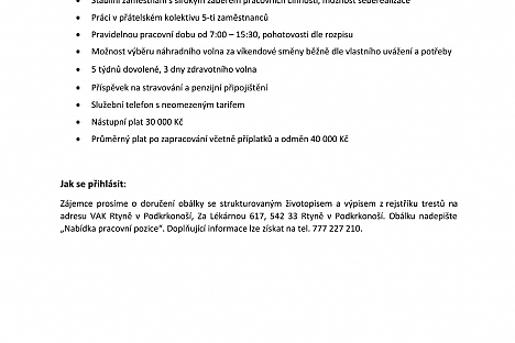 Místo výkonu: Rtyně v Podkrkonoší, nástup možný ihned nebo dle domluvy.