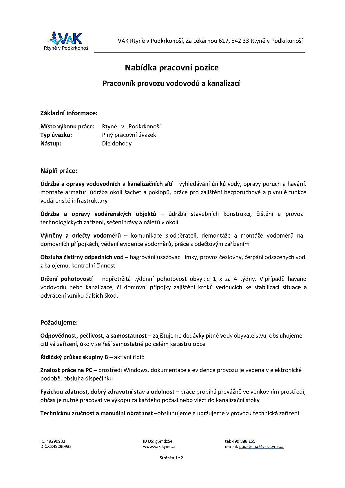 VAK Rtyně v Podkrkonoší přijme pracovníka nebo pracovnici provozu vodovodu a kanalizací.