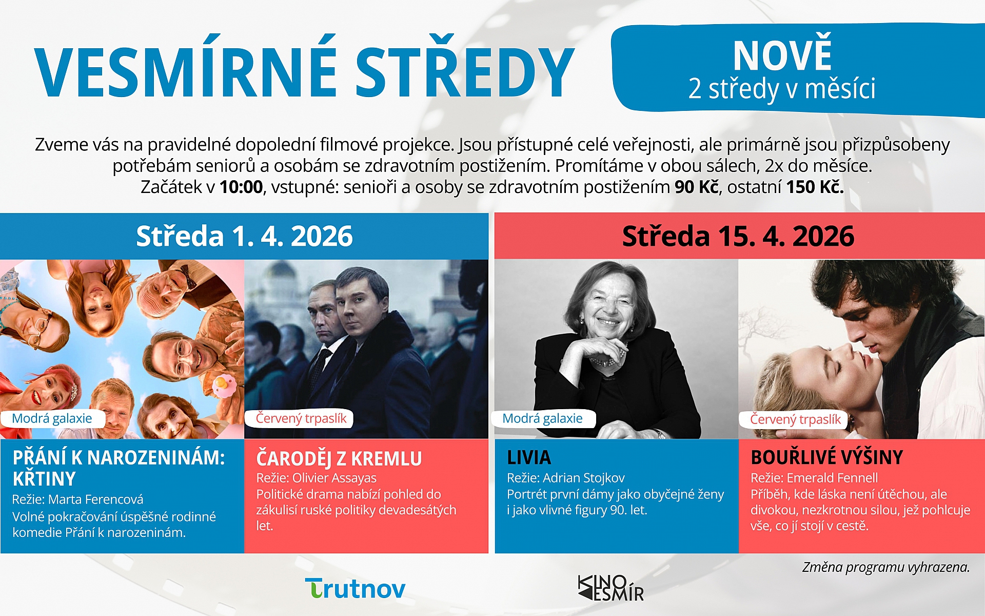 Ve středu 01.04.2026 kino Vesmír v rámci Vesmírných střed promítá výběr ze dvou film, a to Přání k narozeninám: Křtiny (volné pokračování úspěšné rodinné komedie Přání k narozeninám) a Čaroděj z Kremlu (politické drama nabízející pohled do zákulisí ruské politiky devadesátých let). Začátek je v 10 hodin, vstupné pro seniory a osoby se zdravotním postižením 90 Kč, pro ostatní veřejnost 150 Kč.