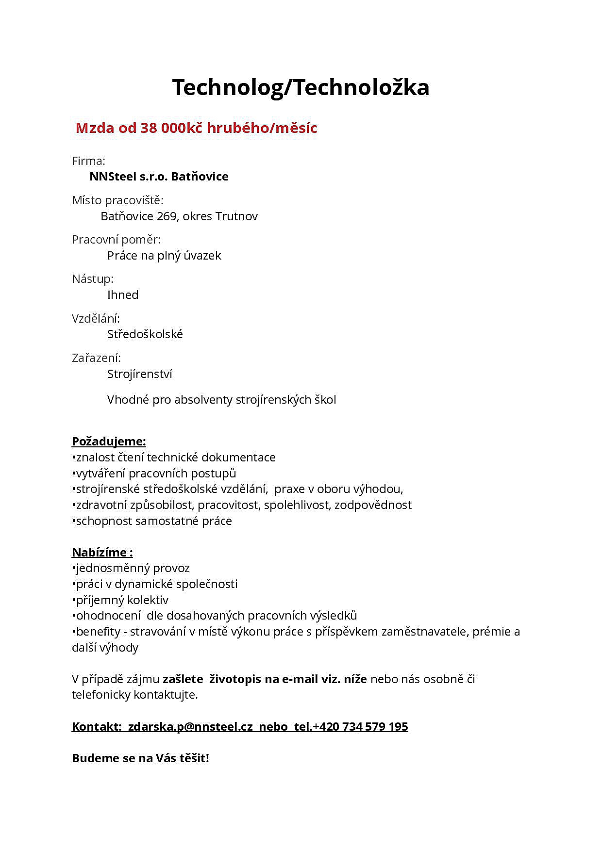 Pošlete svůj životopis na: zdarska.p@nnsteel.cz, nebo volejte na tel. číslo 734 579 195.